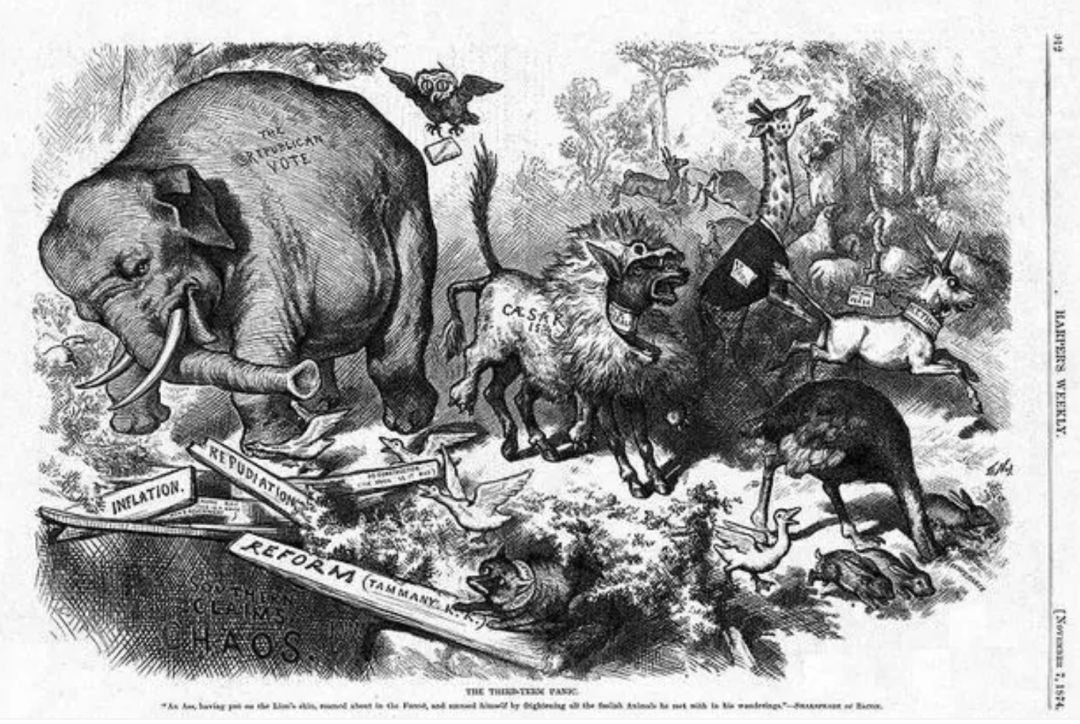 1870年,他就用一头驴指代民主党,意思为正是因为他们的愚蠢美国才卷进了内战,纳斯特本人支持共和党,但并没有对共和党“笔下留情”,1874年画了一幅摔倒的大象,用它代表不满共和党总统格兰特执政的共和党选民。同年,共和党在国会中期选举中大败,纳斯特又画了一幅受困的大象予以讽刺。当时纳斯特的作品属于全美爆款,民众在他潜移默化的影响下,主动用两只动物指代两党,再后来两党也承认了这两种动物能代表自己,还把这俩动物吹了一番,别人说驴愚蠢,民主党就说驴懂得坚持,别人说大象迂腐,共和党说大象稳重,于是就有了今天的驴象之争。