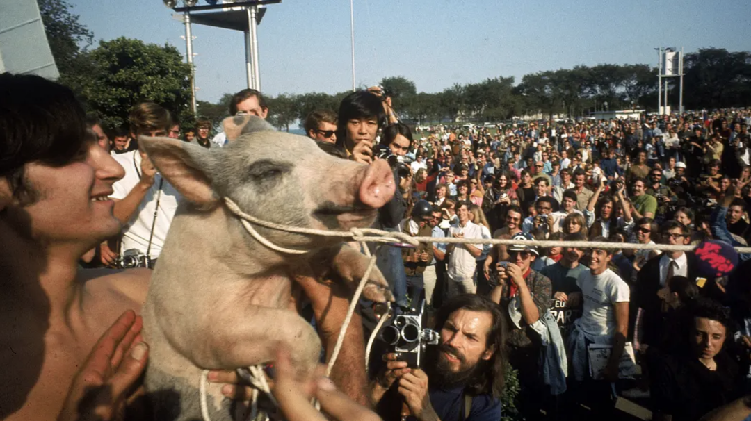 ◇ 图为1968年的民主党全国代表大会上,艾比·霍夫曼创立的国际青年党游行他们的总统候选猪