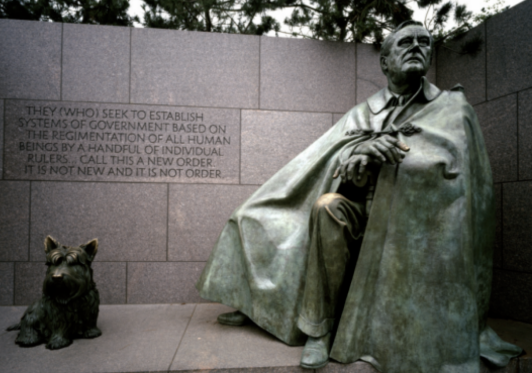 ◇ 图为富兰克林·罗斯福总统和他的爱犬法拉铜像