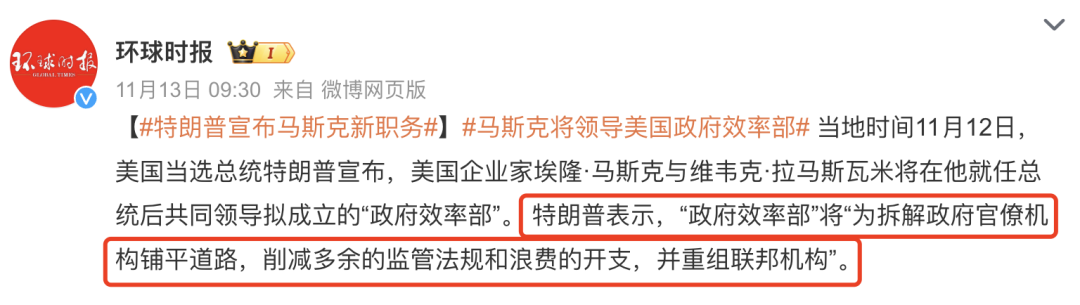 在马斯克和维韦克·拉马斯瓦米的文章《政府效率部的政府改革计划》中有如下表述:“在美国建国之初,我们的国家基于这样一个基本理念:由我们选举出来的人运行政府。但美国今天的运作方式不是这样。大多数法令不是国会颁布的法律,而是由非选举官僚颁布的“规章制度”——每年有成千上万的规章制度出台,给纳税人带来直接和间接的巨大成本。······我们将协助特朗普过渡团队,寻找并雇用一支精干的、由小政府倡导者组成的团队,美国一些最优秀的技术和法律人才将被纳入麾下。······我们会在每一环节向政府效率部提供建议,以期在三个主要方面推进改革:撤销监管、精简行政机构和节约成本。”