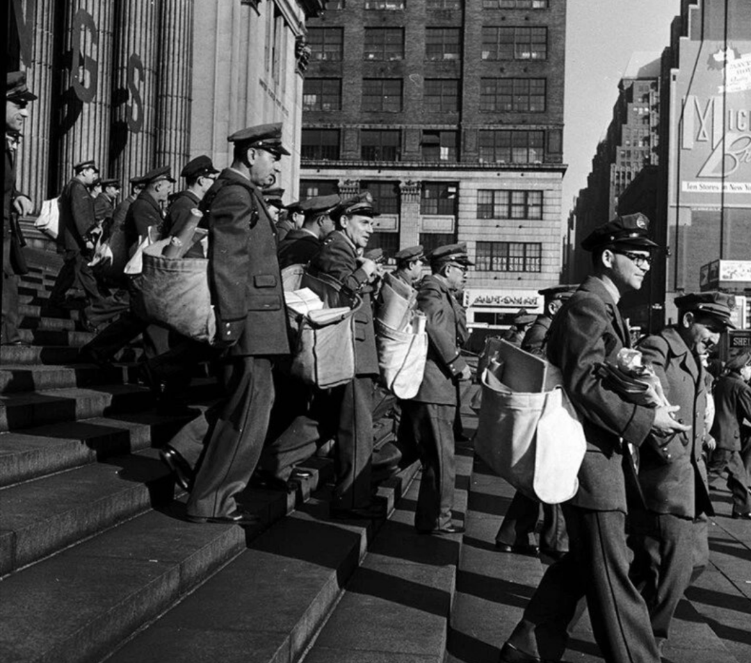 ◇ 图为1955年圣诞节,纽约邮递员从邮局发送邮件