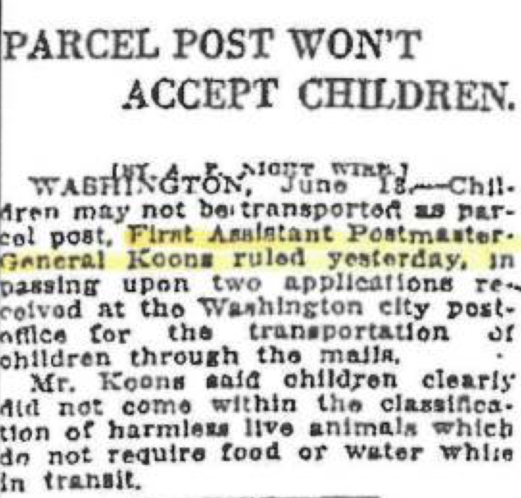 ◇ 图为1920年6月13日的《洛杉矶时报》登文:儿童不再被允许经邮寄运送