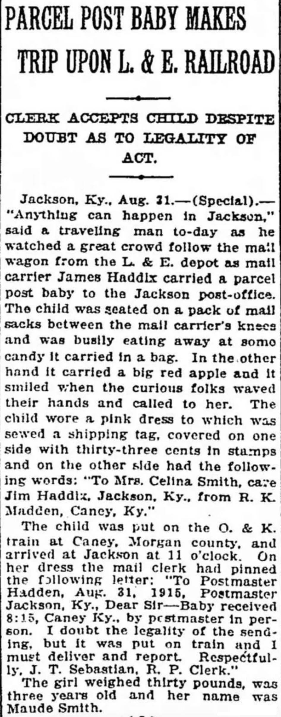 为了进一步证实邮寄孩子的可行性,1913年在刚刚推出这项服务不久,滨州的一位居民就向邮政部长的部长信箱送信,询问邮寄孩子都需要什么注意事项,邮政部长也没想到民众有这么奇葩的脑回路,一时间难以回答。眼见部长大人已读不回,那么法无禁止即可为,人们开始将邮寄孩子的想法付诸实践。1913年就出现了第一个用邮件发送儿童的案例,不出所料,这事很快成为头条新闻,美国各地也很快出现了类似案例。