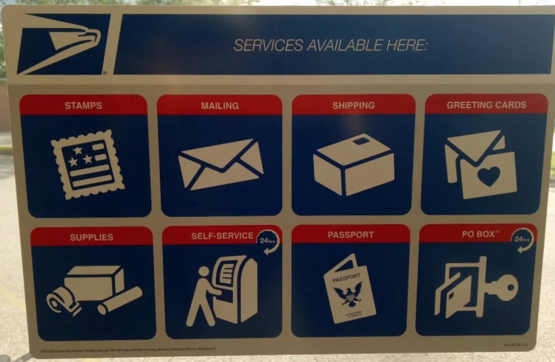 ◇ 图为美国邮局提供的8种服务:购买邮票、寄信、寄包裹、寄贺卡、打包、自助、护照办理及邮箱租赁等