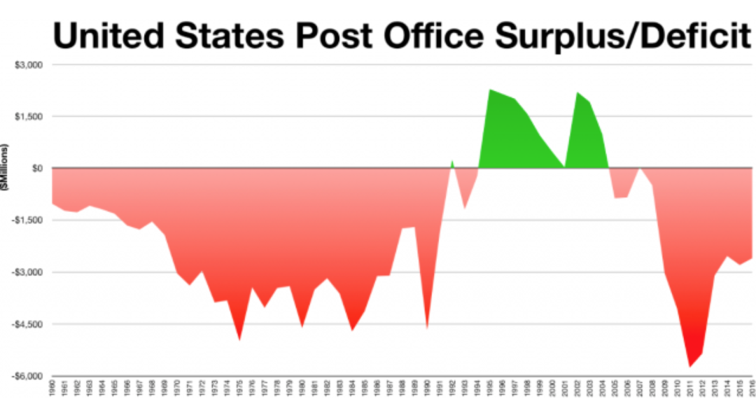 ◇ 图为1960-2016年美国邮政局历年盈利/赤字,可见美国国企也是长期处于亏损状态