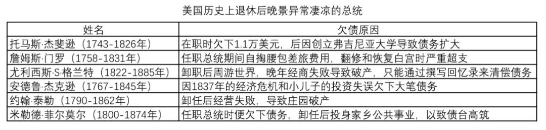 比如第三任总统杰斐逊就开了前总统破产的先河,本来他家产有不少,在家乡弗吉尼亚拥有5000英亩的种植园与200名奴隶。可是,由于卸任之后不善于打理种植园,也没有其他经济来源,加上天灾的袭击,最后负债累累,本来想靠着拍卖土地来还清债务,但他的土地涉及到所有权问题,没有契证拍卖不了,结果杰斐逊只能守着一大片荒地过着一贫如洗的日子,面对巨额债务只能靠出售藏书来还债。