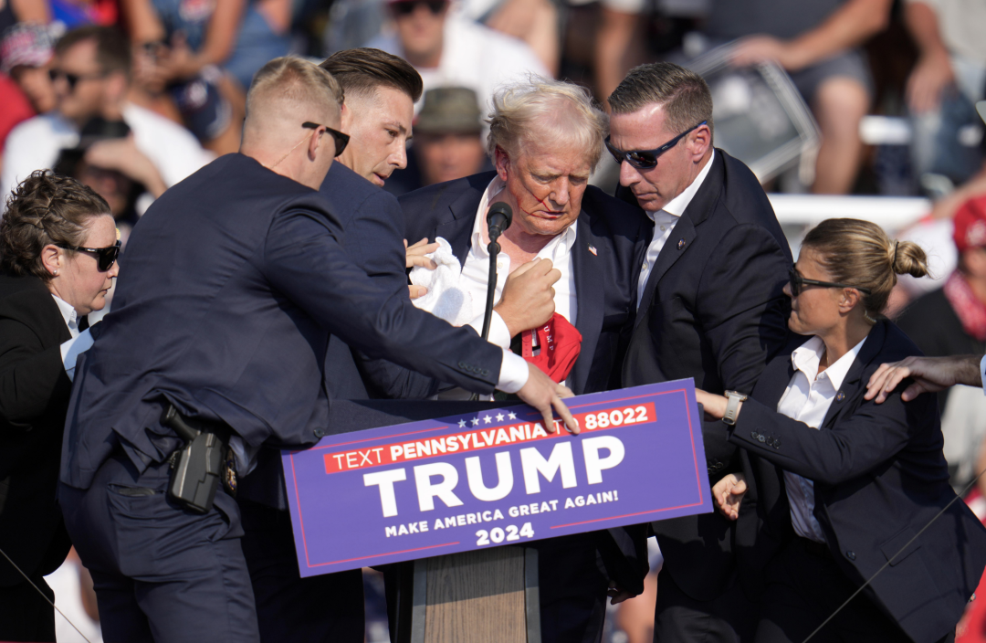 ◇ 图为特朗普在竞选演讲现场被枪击后,特勤局特工冲上台保护这位前总统