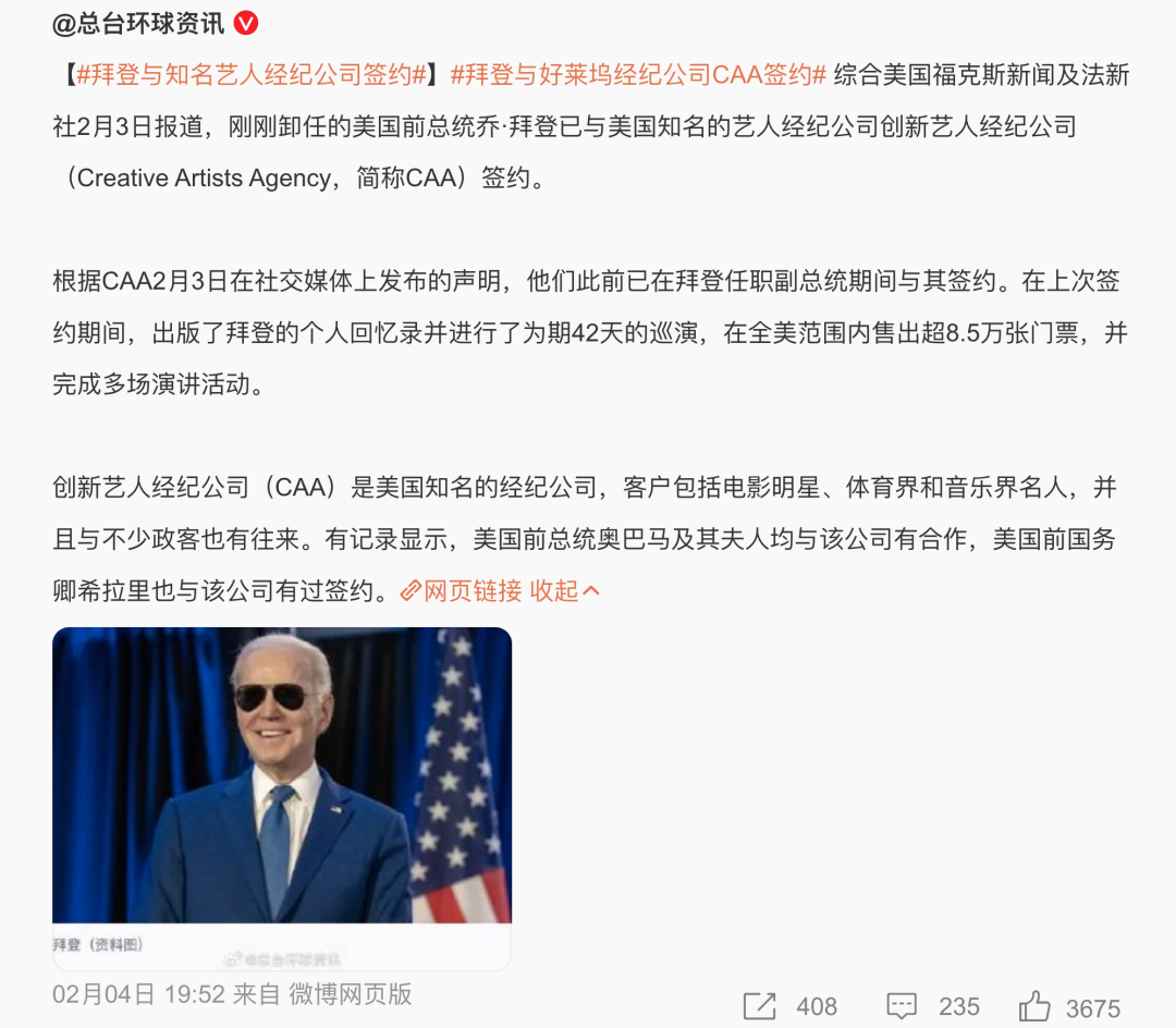 ◇ 图为拜登签约经纪公司的新闻截图