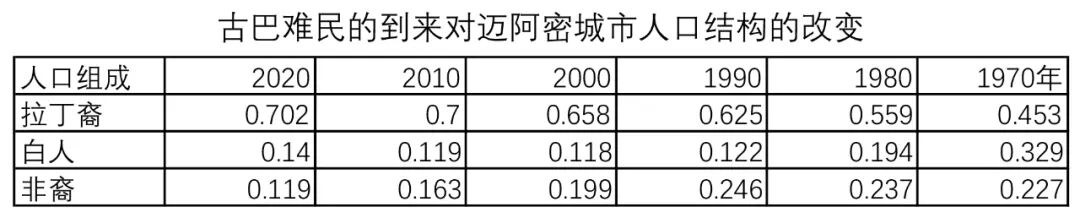 ◇ 截止2020年,迈阿密城区约44万人,其中约13万是古巴裔。整个大迈阿密区,600多万人口中,拉丁裔约46%,其中古巴裔约120万 图为1970-2020年,拉丁裔,白人,非族在迈阿密城市人口结构占比