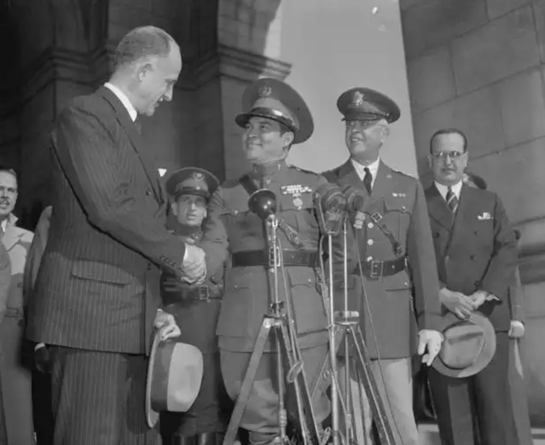 ◇ 图为1938年,访美的巴蒂斯塔与美国陆军参谋长马歇尔握手