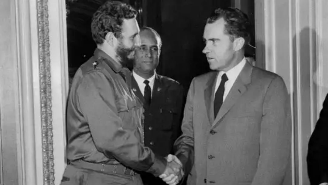 ◇ 图为1959年,古巴革命胜利后,风光无限的卡斯特罗访美与时任美国副总统尼克松握手