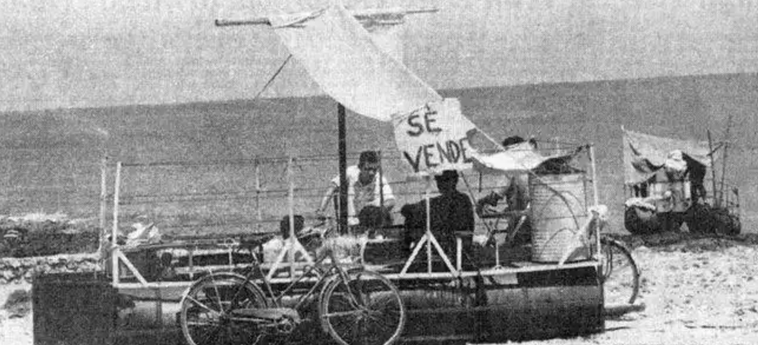 ◇ 图为1994年,在古巴一处海滩上,一艘带有“待售”标志的木筏
