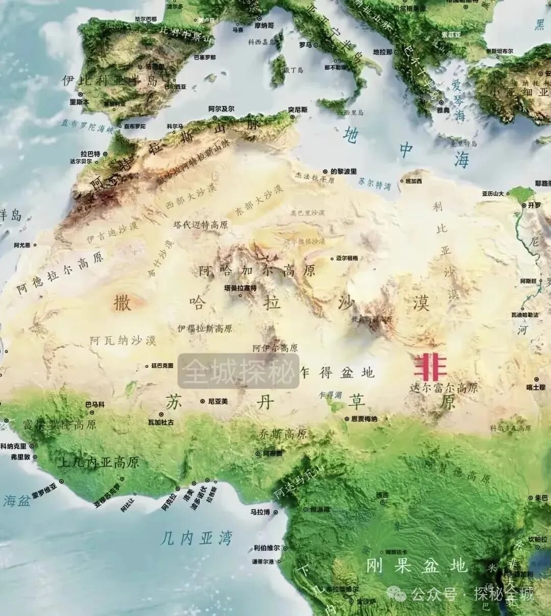 这个沙漠原本就是由很多中小型沙漠组成,但所在的北非地区呢,地势平坦缺乏高大山地高原,区域内海拔最高的山脉是提贝斯提山脉平均海拔只有2500米,山脉主峰库西山同时也是北非地区的最高点,海拔也才3415米;