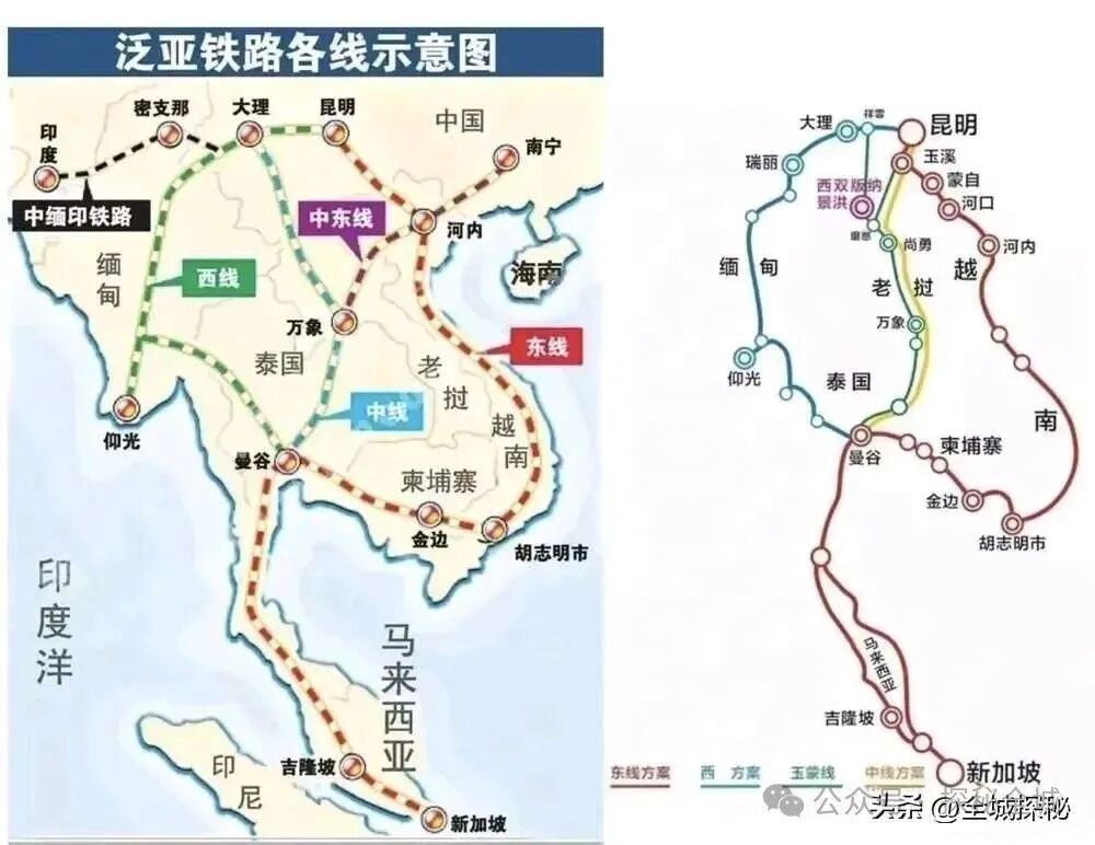 当年中国提出泛亚铁路网后,根据中南半岛的区位布局以及地形特点,规划了东线、中线以及西线三条主要的南北向铁路干线;