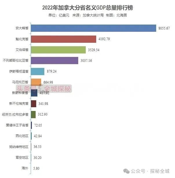 以2022年为例,安大略省当年GDP达到8055亿美元,占全加拿大的37%以上,排名第二的魁北克省为4192亿美元,大约是安大略省的一半。