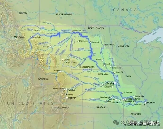 1.它的河道海拔落差非常大,其源头所在的落基山北段,海拔高达4300米,到与密西西比河交汇处时,海拔已经降到120米左右;