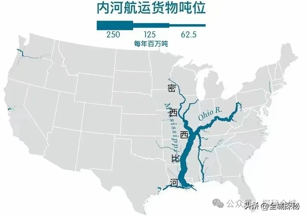 这一点很明显,密西西比河通过支流伊利诺伊河、俄亥俄河以及众多的人工运河与五大湖连通,成为覆盖美国大部分国土的内河航运网络的一部分,在今天依旧发挥着重要作用;