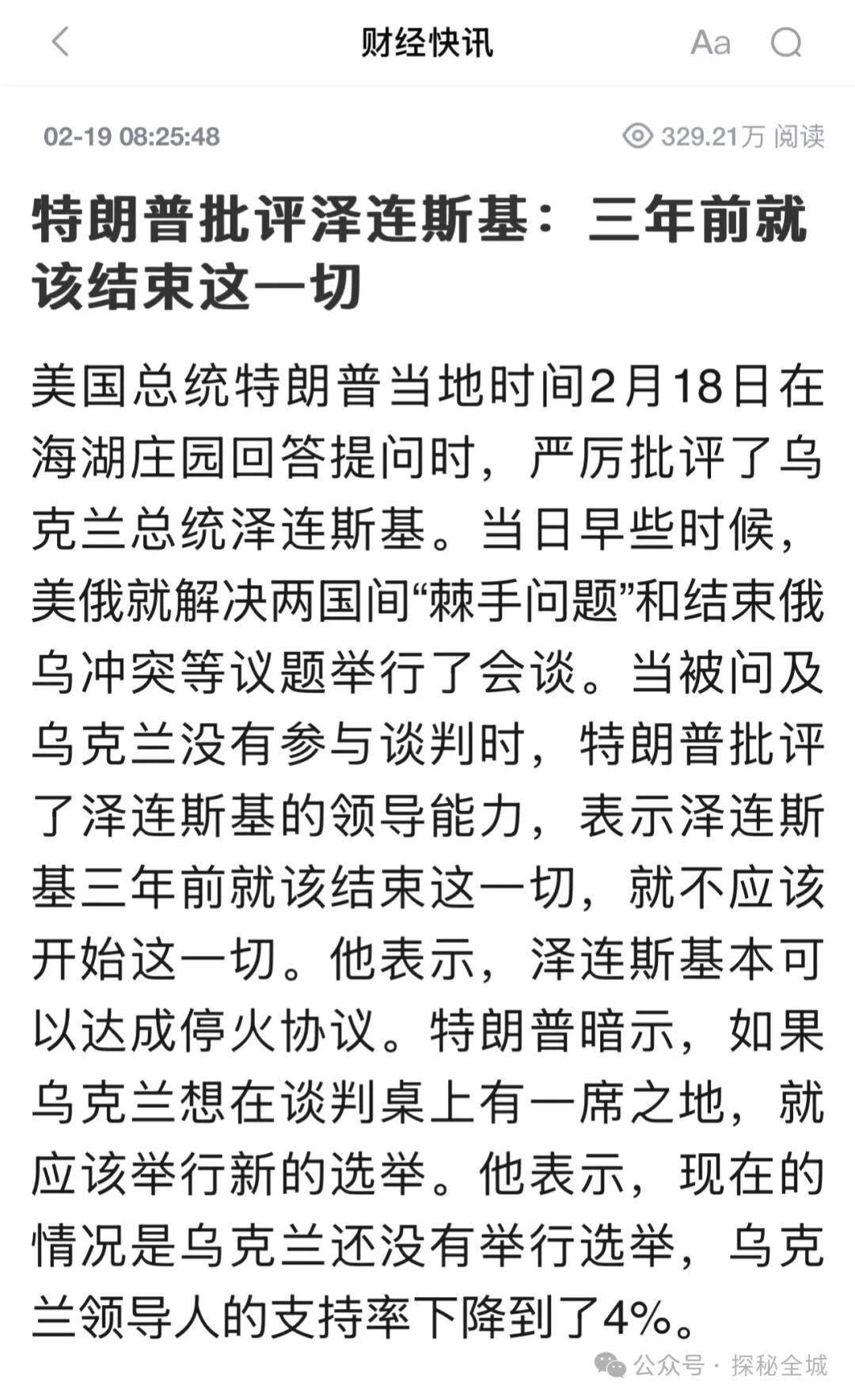 6.特朗普暗示,如果乌克兰想上谈判桌,就应该举行新的选举,他还表示乌克兰领导人的支持率下降到了4%,言外之意是需要换掉泽连斯基,但泽连斯基表示,在乌克兰被欧盟和北约接纳,以及俄罗斯军队撤出之前,他都是这个世界所必须的角色。