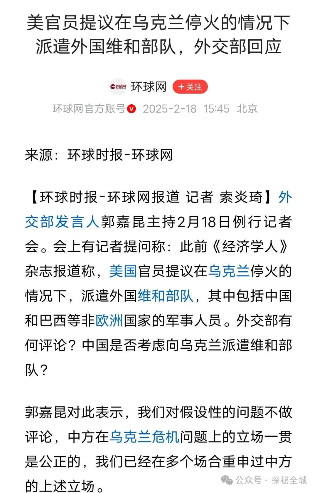 据媒体报道,此前不久,美国官员曾向欧洲提出,俄乌谈判达成协议后,有必要让中国和巴西等国派出维和部队进驻乌克兰,直接部署到停火线充当缓冲区;