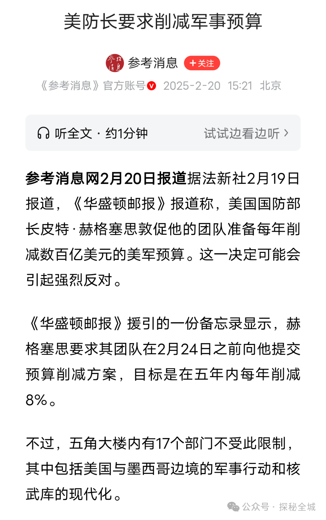 据媒体报道,美国国防部长合赫格塞斯要求国防部在2月24日之前向他提交预算削减方案,目标是在五年内每年削减8%。
