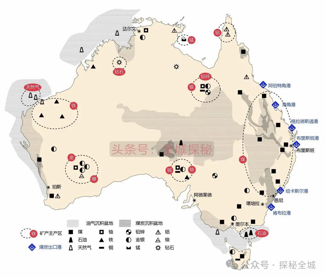 而澳大利亚的资源分布也很有意思,几乎都分布在海岸线附近,其中煤炭主要分布在东海岸,铀矿主要分布在南海岸,铁矿和天然气主要分布在西海岸;
