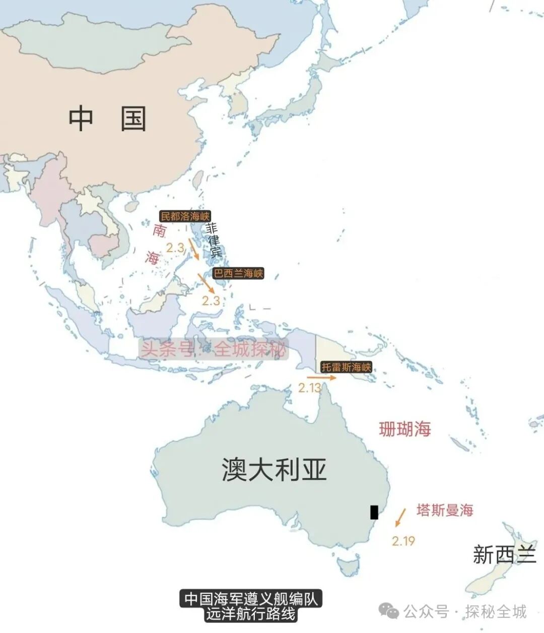 回头看看遵义舰编队的远洋航行轨迹,就会发现,在2月3日,舰队从南海海域向东穿过民都洛海峡进入苏禄海,随后又穿过巴西兰海峡进入苏拉威西海,到2月13日自西向东从阿拉弗拉海穿过托雷斯海峡进入珊瑚海,再到2月19日出现在悉尼以东的塔斯曼海;