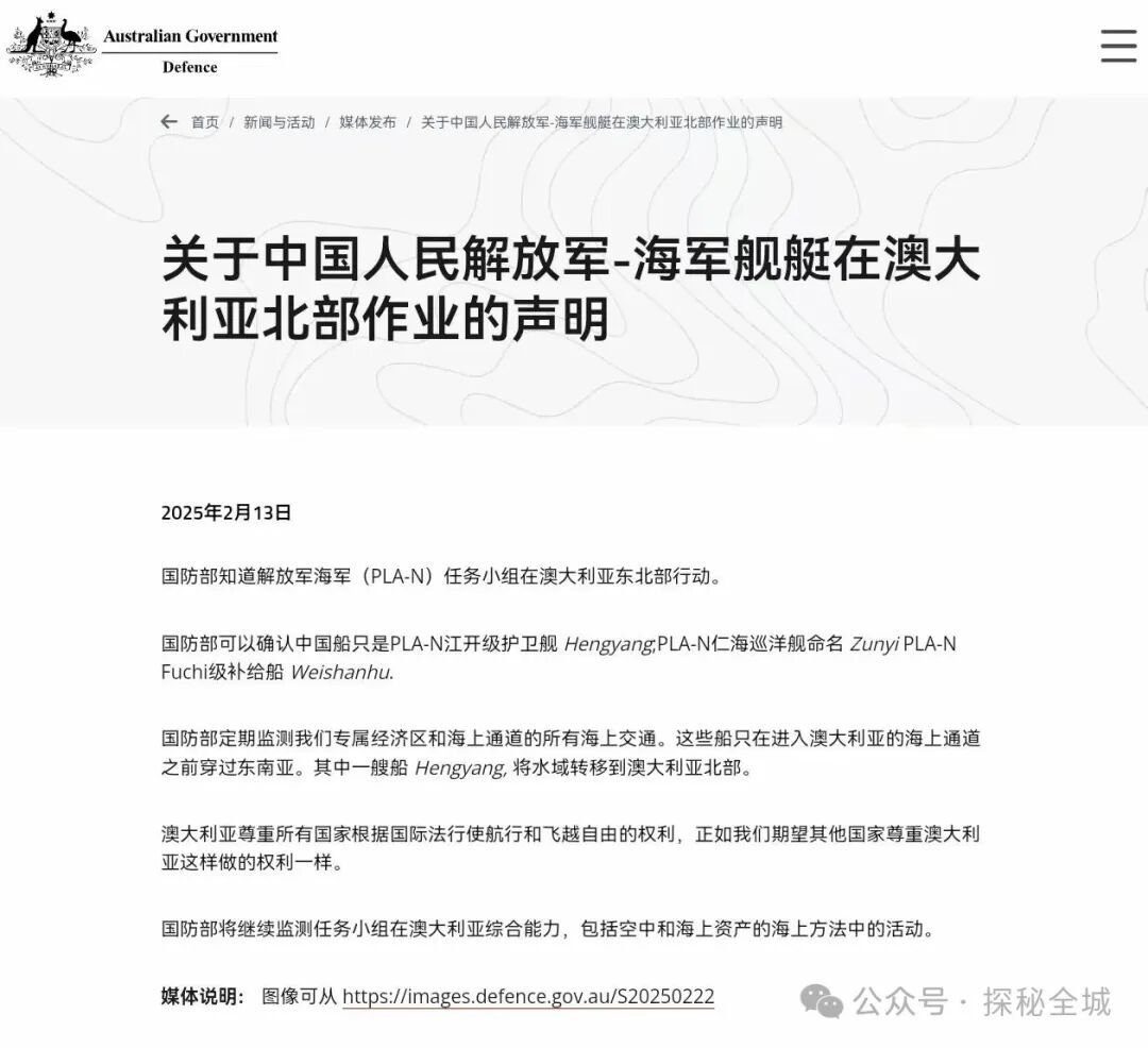 当地时间2月13日,澳大利亚突然发表声明,称中国海军这支舰艇编队在当天穿过托雷斯海峡进入澳大利亚东北部海域;