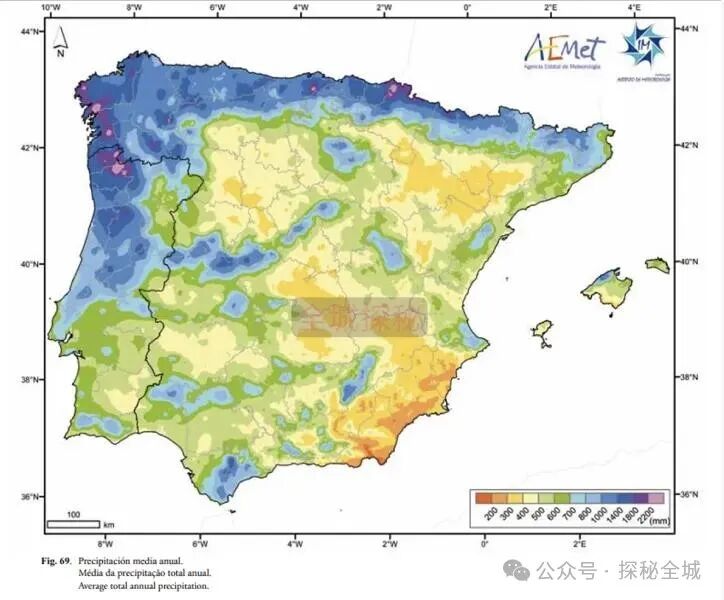 2.西班牙虽然地处伊比利亚半岛,但大部分区域都属于干旱和半干旱气候,降水稀少,即使是东南部相对湿润的地中海气候区域,年降水量也只有300-600毫米;