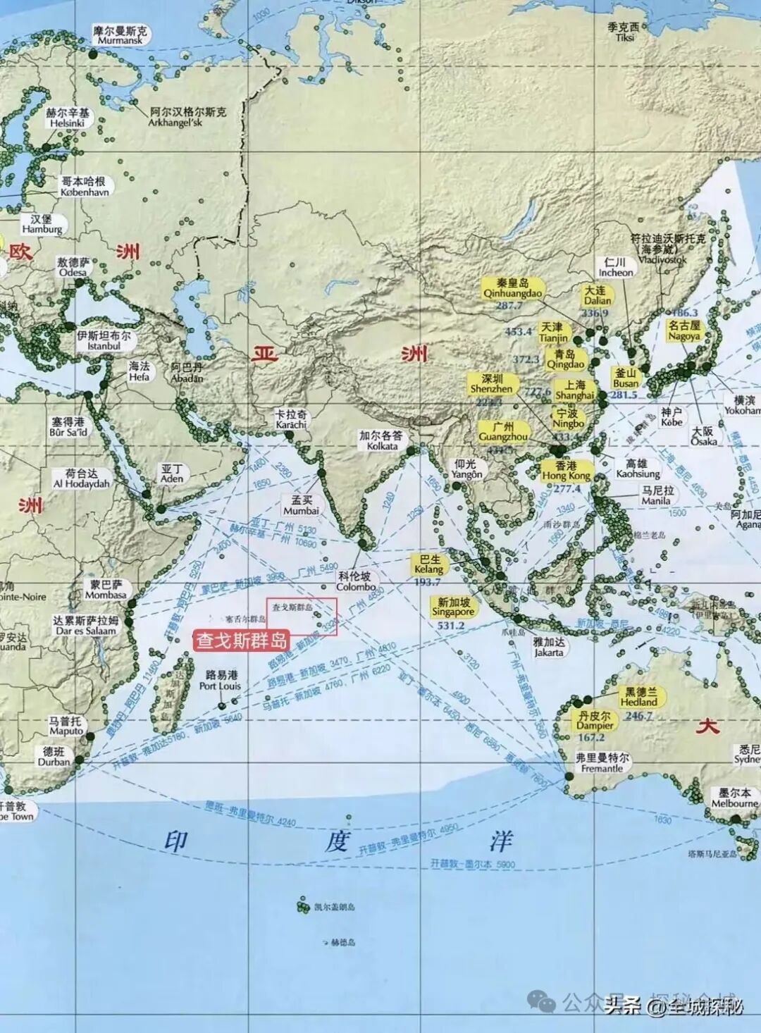 从地理位置上看,查戈斯群岛的优势也相当明显,地处印度洋中心,跟印度洋周边一些重要区域的距离大致相同,比如: