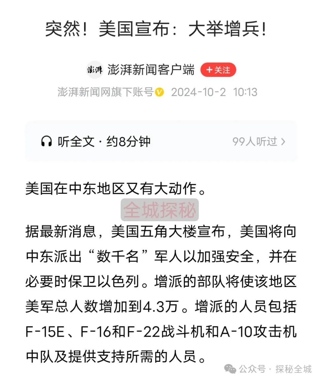 当然,美国的支持并非停留在口头上,美国原本在中东地区就有数万驻军,而在当地时间9月30日,美国又宣布,将向中东派出数千名军人必要时包围以色列,美国在中东驻军由此将增加到4.3万;