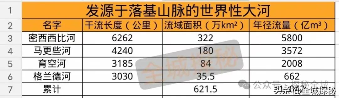 整体上,以落基山脉为源头的4条世界性大河,流域面积加起来达到621.5万平方公里,年径流量合计达到12042亿立方米。