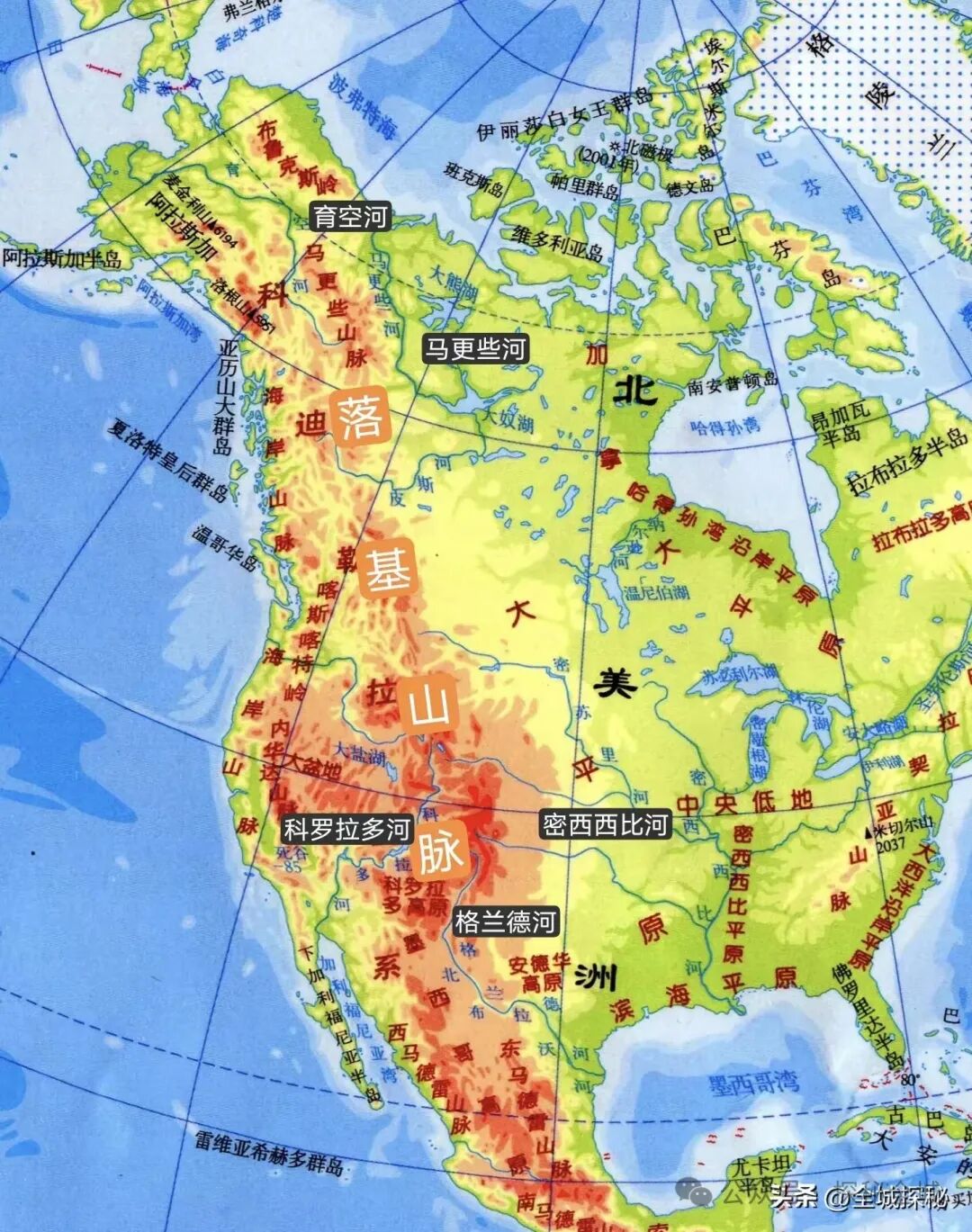 北美洲地形图,落基山脉是很多世界性大河的发源地