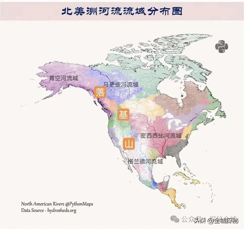 在整个北美洲,除了圣劳伦斯河之外,几乎所有的世界性大河,源头都位于落基山脉,包括注入大西洋的密西西比河与格兰德河,注入北冰洋的马更些河,以及注入太平洋的育空河,等等;