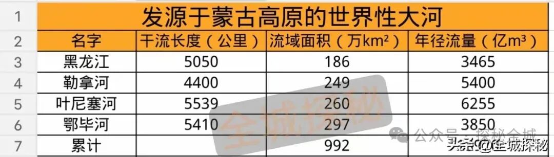 整体上,发源于蒙古高原周边的4条世界性大河,流域面积加起来高达992万平方公里,年径流量合计达到18970亿立方米。