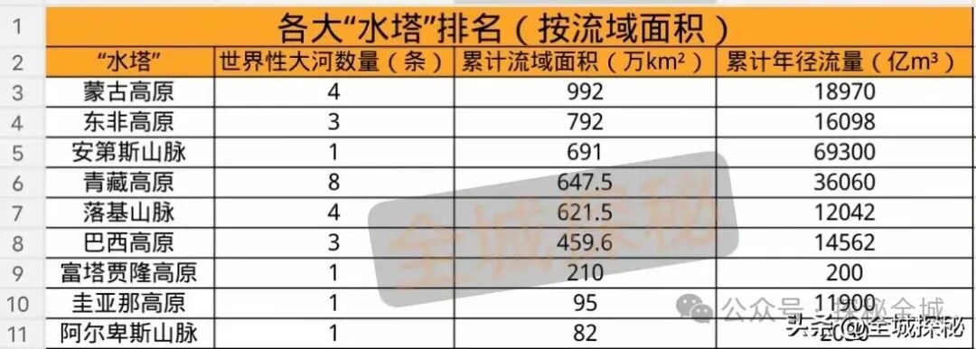 其他的“水塔”里,东非高原排名第二,流域面积加起来为792万平方公里,安第斯山脉位列第三,691万平方公里,青藏高原第四,647.5万平方公里;
