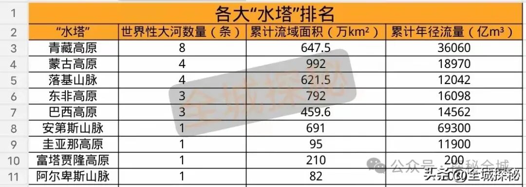 对比一下上面提到的几个“水塔”,青藏高原是8条世界性大河的发源地,它们加起来,流域面积也才647.5万平方公里,年径流量也才36060亿立方米;
