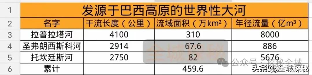 整体上,发源于巴西高原的3条世界性大河,流域面积加起来达到459.6万平方公里,年径流量14562亿立方米。