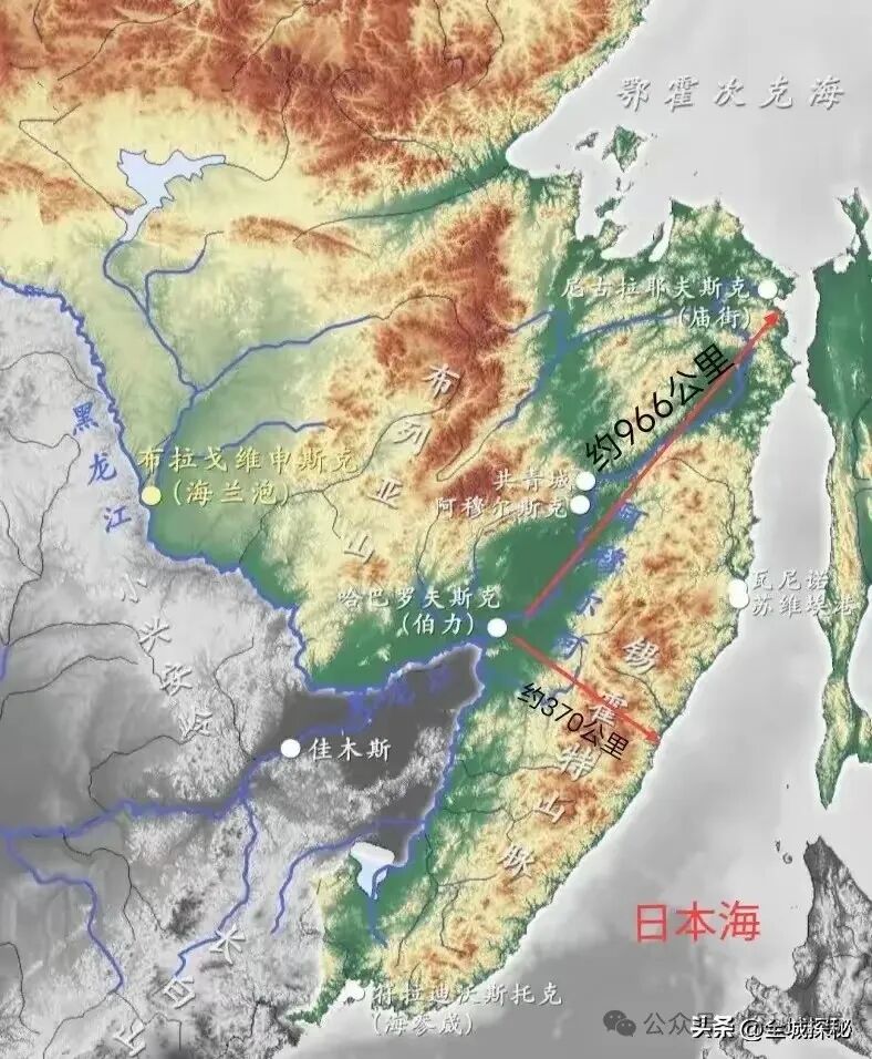 从位于哈巴罗夫斯克的黑龙江河段算起,到日本海海岸只有约370公里,但黑龙江也被锡霍特山脉阻挡,向北又延绵了约970公里才成功入海;