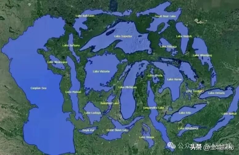 上图是世界主要大湖对比,下图是湖泊面积排名