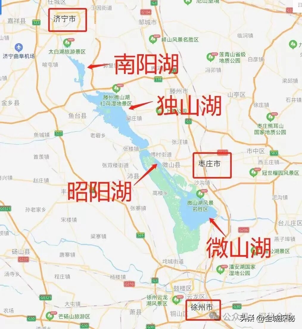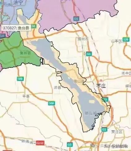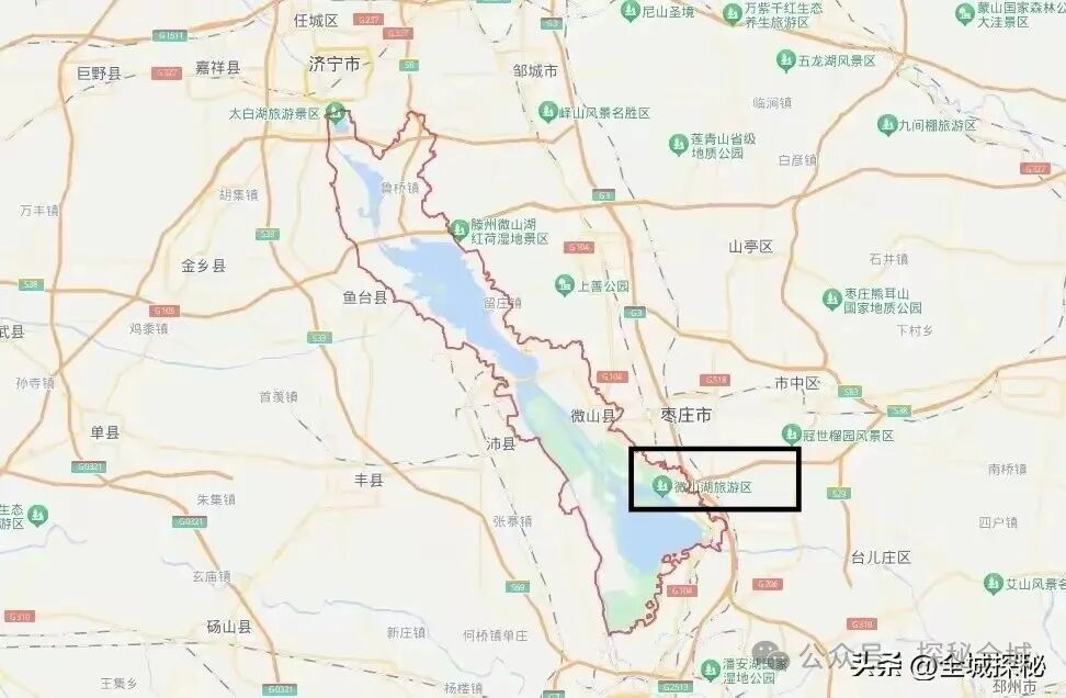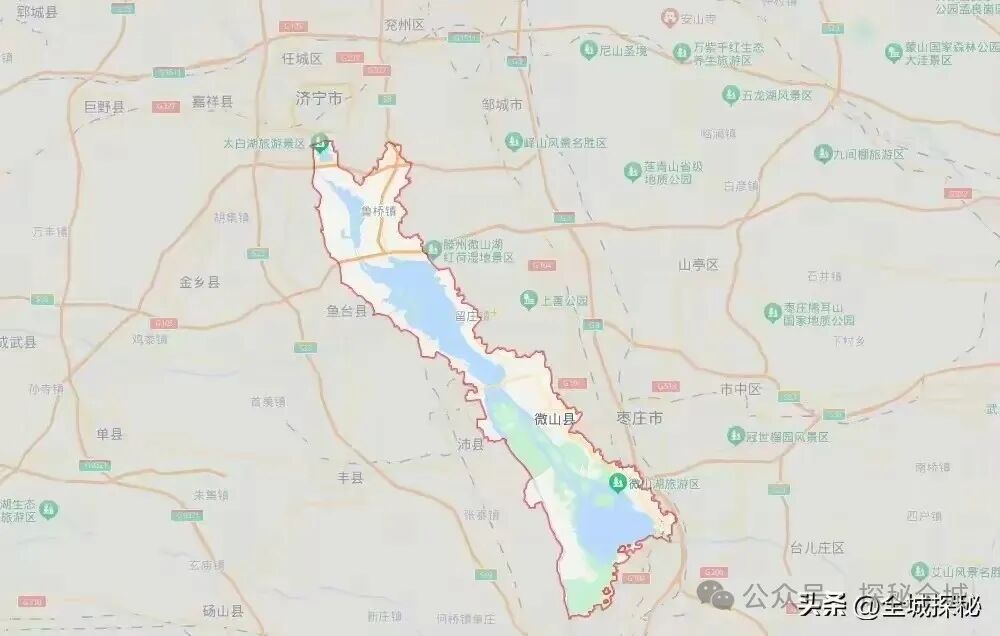 看看济宁市地图就会发现,微山湖以及微山县,就像是一条非常长的尾巴,跟济宁市其他县区区别很大,完全深入到了江苏境内;