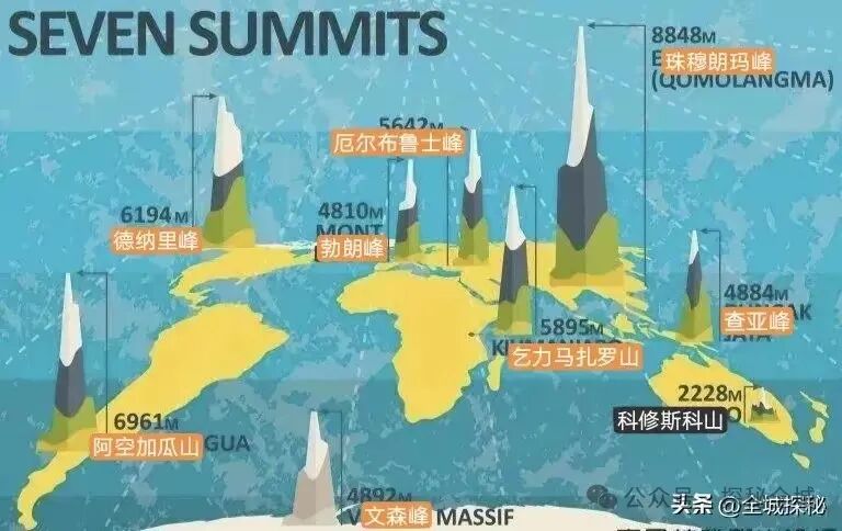 北美洲最高峰是德纳里峰,海拔6194米,也是科修斯科山的2.7倍以上,非洲第一高峰时乞力马扎罗山,海拔5895米,是科修斯科山的2.6倍,欧洲第一高峰厄尔布鲁士峰,海拔5642米;