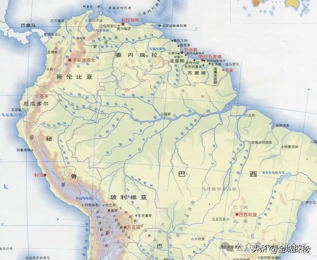不过个人觉得,亚马逊平原更像是一个大盆地,其西边是纵贯南美大陆西侧的安第斯山脉,平均海拔超过3000米,北边是海拔约300-400米的圭亚那高原,南边是海拔在300-1500米之间的巴西高原;