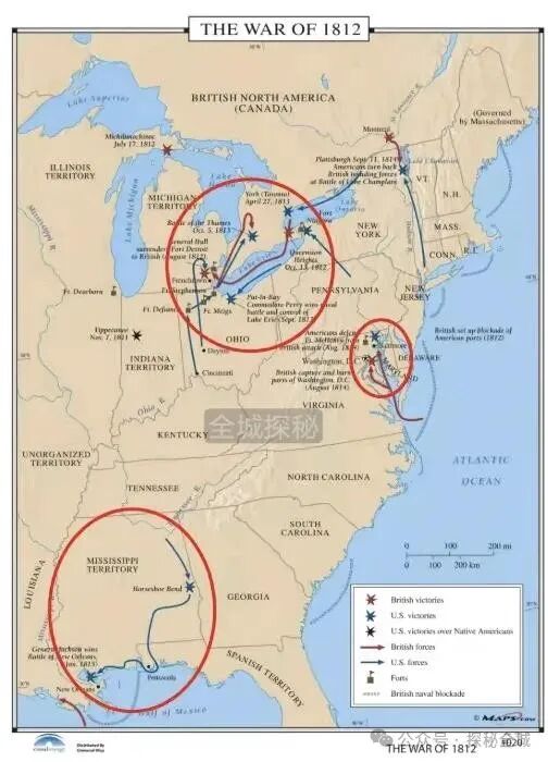 1814年,英国在欧洲击败拿破仑帝国后,终于腾出手,从欧洲抽调兵力发动反攻,我们所熟知的火烧美国国会以及白宫等历史事件,就发生在这一时期;