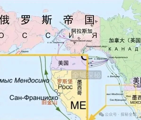 在今天,很多人可能都以为历史上俄国在北美的殖民地只有今天的阿拉斯加州,但实际上,俄国人沿着太平洋海岸线南下,曾占据了相当大区域,最远甚至到达了北纬45度附近,也就是今天的加利福尼亚地区;