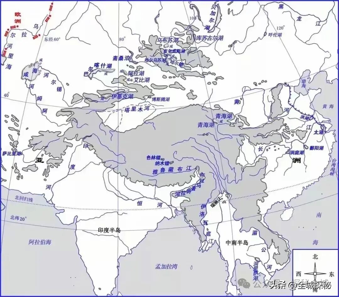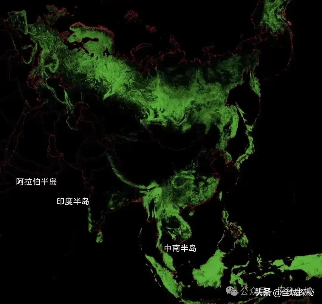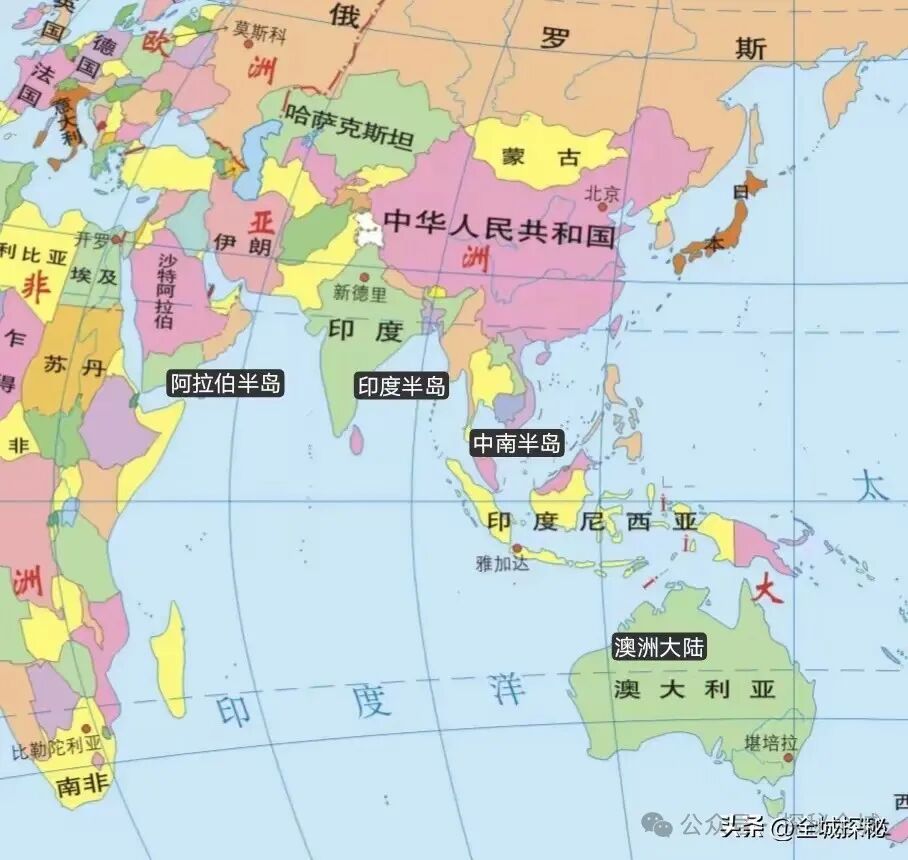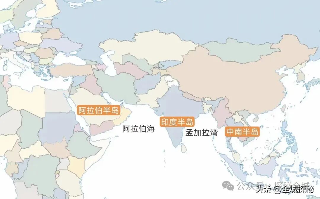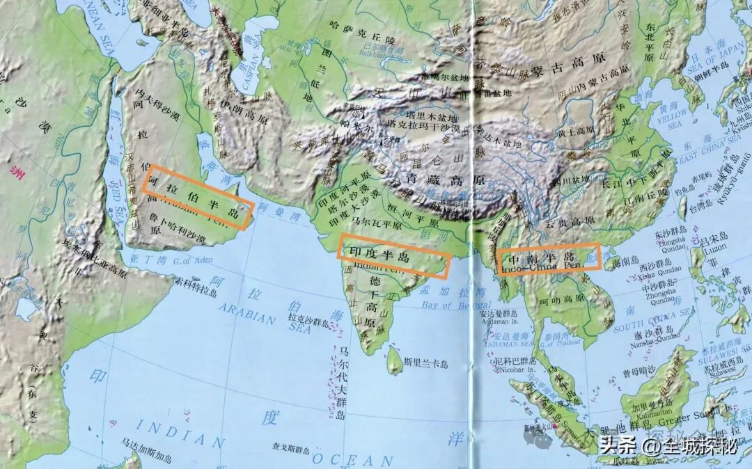 在亚欧大陆南部,分布着三座半岛,自西向东分别是阿拉伯半岛、印度半岛和中南半岛。