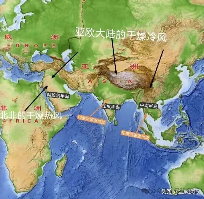 而当中南半岛和印度半岛进入旱季时,阿拉伯半岛也面临着来自西亚、中亚辽阔沙漠地带乃至亚欧大陆内部的干燥冷风;