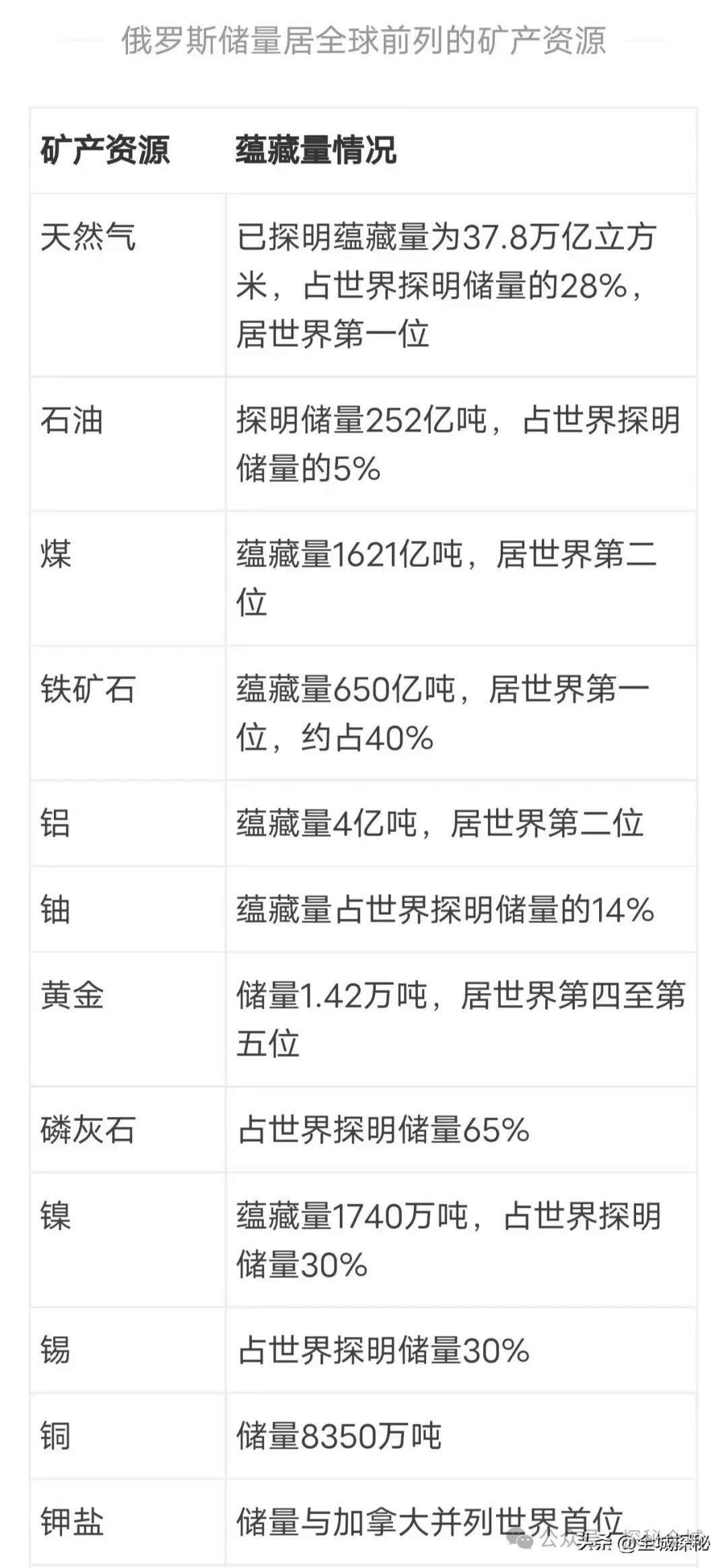 俄罗斯主要矿产资源储量
