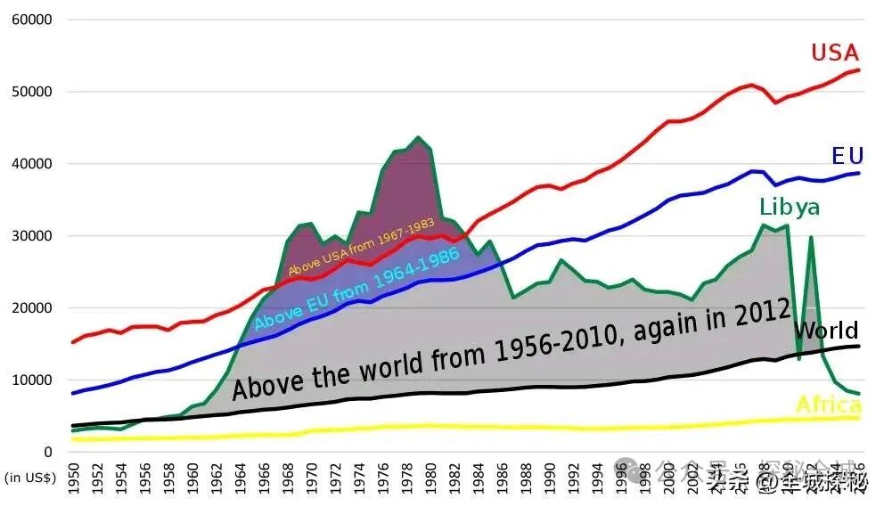 过去数十年利比亚人均GDP与美国、欧盟对比