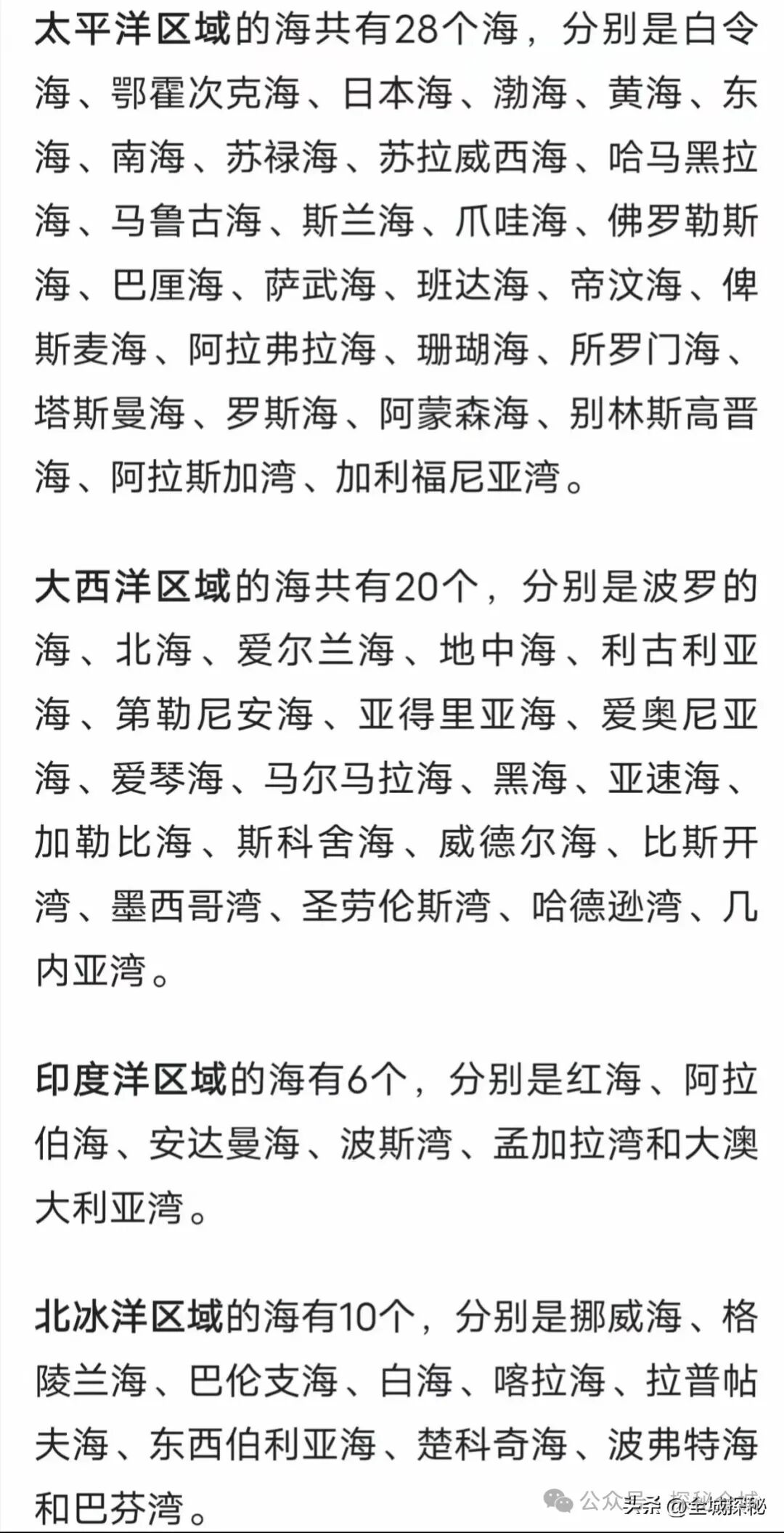 这些海洋具体而言,又可以分为太平洋、大西洋、印度洋和北冰洋四大洋,以及附属于它们的54个海、10个海湾;
