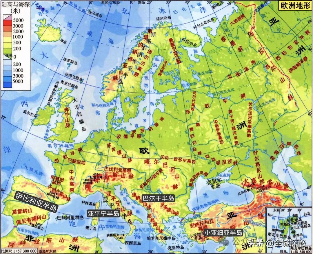 其南部的非洲和东边的亚洲的一部分海岸线都比较平缓,北边属于欧洲的部分以及东北边的亚洲部分,海岸线则相当曲折漫长,自西向东分布着伊比利亚半岛、亚平宁半岛、巴尔干半岛和小亚细亚半岛等四大半岛,堪称全世界海岸线最曲折的地方之一。